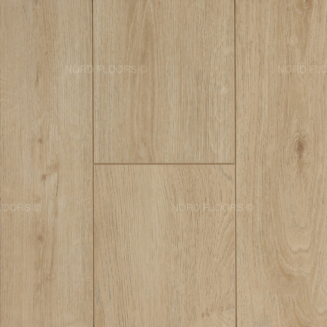 The color of the laminate is Beige, and it features a bevelled edge for a more defined look. The surface texture is embossed in register (E.I.R.), which adds depth and realism by replicating the Natural grain patterns of wood. The flooring has a clean and refined appearance, making it suitable for various rooms such as bedrooms, dining rooms, hallways, and living rooms.